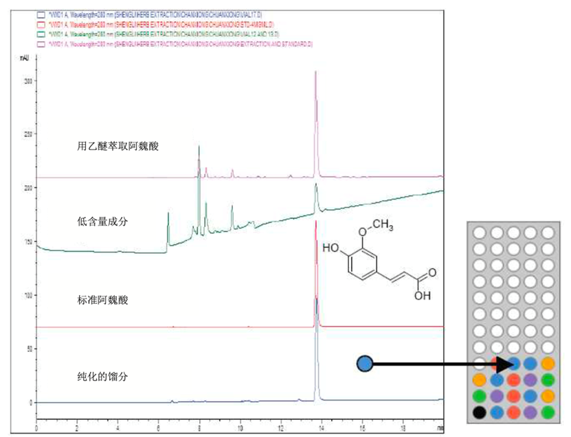 藥用植物是藥物開發的重要資源。在生物化學,制藥及臨床研究中通常會分析它們的復雜成分及生物活性成分。眾所周知,阿魏酸是在根莖川芎中發現的最主要的生物活性成分「1」。使用 Pure Flash 色譜系統分離純化該植物提取物,并鑒定其中的稀有成分。