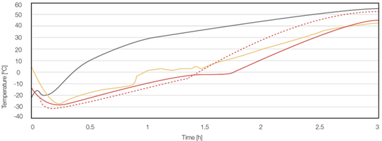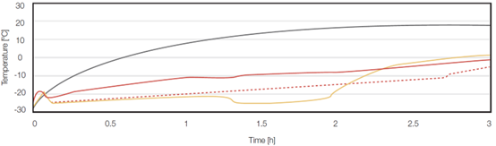 ▲ 圖2:沒有陽光直射的冷凍干燥過程溫度曲線。黑線表示貨架溫度,紅線表示 1% PVA(虛線)和 5% PVA(實(shí)線)的干燥曲線,黃線表示 5% 海藻糖的干燥曲線