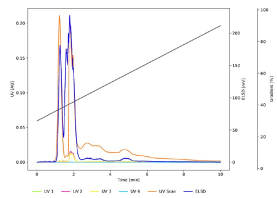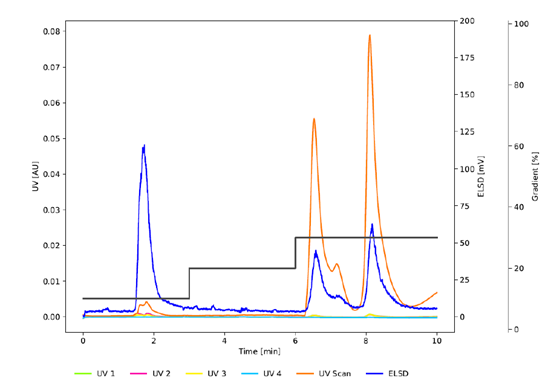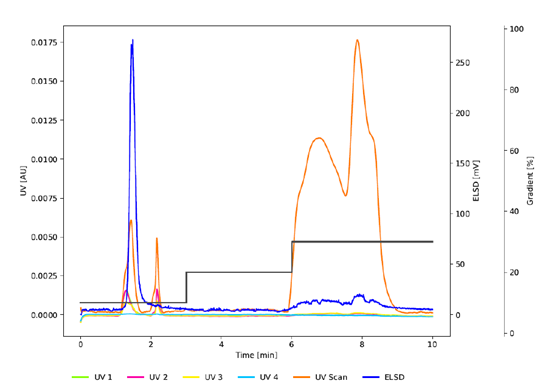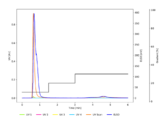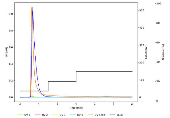 圖3 為與 圖2 相同條件下的色譜圖,使用C18非WP (100 ?) (PrepPure C18, 10 μm)研究孔徑的影響。雖然紫外信號表明與C18WP相比,前兩個峰的分辨率提高了,但較低的吸光度和ELSD信號表明沒有發生有效的分離。C18WP的大孔徑(300 ?)使蛋白質能夠穿透顆粒并有效地與固定相相互作用。相比之下,PrepPure C18 (100 ?), 10 μm無法實現分離,因為蛋白質只能與顆粒的外表面相互作用。這種有限的相互作用減少了吸附和解吸之間的平衡步驟的數量,從而影響了分離效率。