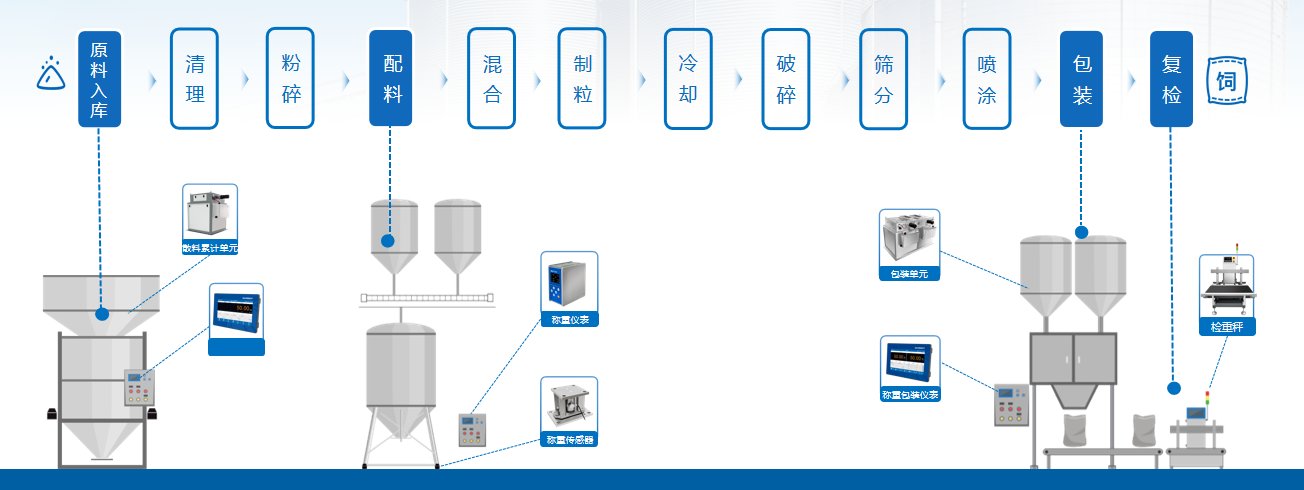A . 精準性高,降低損耗: ● 杰曼稱重儀表具備高精度和穩定性,精準控制配料及包裝,確保飼料配方的準確性,滿足營養需求,提高產品質量; ● 杰曼稱重產品避免人工稱重中的誤差與浪費,節約原料成本,減少生產損耗,提升經濟效益; B. 提升效率,高效生產: ● 杰曼稱重產品能夠快速完成多種原料的稱重、包裝和復檢,減少人工操作時間,提高整體生產效率; ● 產品支持多種通訊協議,方便集成在各環節自動化設備中,實現自動化生產; C. 數據傳輸,方便數字化管理: 杰曼稱重產品數據的自動記錄便于工廠數據化管理; 杰曼稱重產品方便集成使整個生產流程更加智能化、可控化,實現實時數據傳輸,方便生產數字化管理; D. 穩定耐用,環境適應性強: 杰曼稱重產品穩定耐用,抗干擾強,適應于飼料工廠粉塵、濕度等復雜環境影響,提高設備使用壽命,保障生產連續性。 03『飼料加工各環節產品應用』