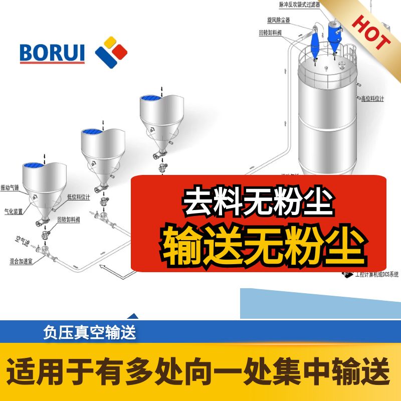 負壓氣力輸送具有可靠的密閉、清潔環境。設備維護要求低,方便工人進行機器操作。可以進行多點充放電。可以采用離心風機和羅茨風機作為動力源,壽命長。負壓輸送管路內無物料堆積,對不同物料具有良好的適應性,能順利輸送粉狀、粒狀物料。