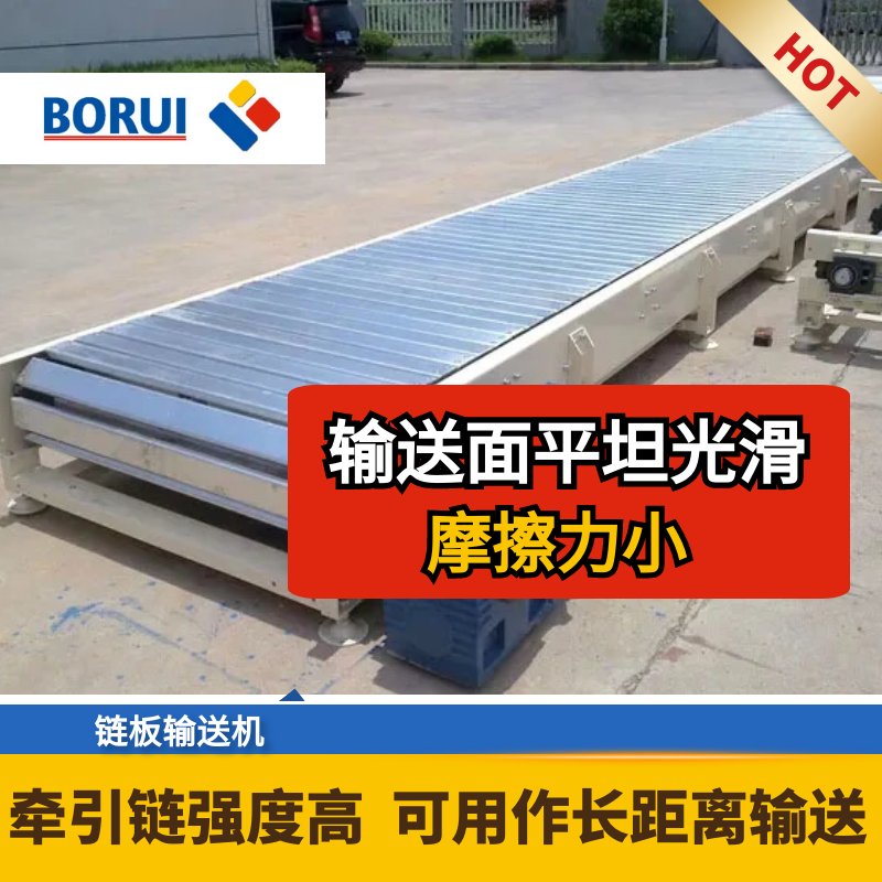 鏈板輸送機是一種以標準鏈板為承載面,由馬達減速機為動力傳動的傳送裝置。鏈板式輸送機,由動力裝置(電機)、傳動軸、滾筒、張緊裝置、鏈輪、鏈條、軸承、潤滑劑、鏈板等等構成。其中帶動物料的輸送的主要的兩個部分為:鏈條,利用它的循環往復運動提供牽引動力;金屬板,作為輸送過程中的承載體。