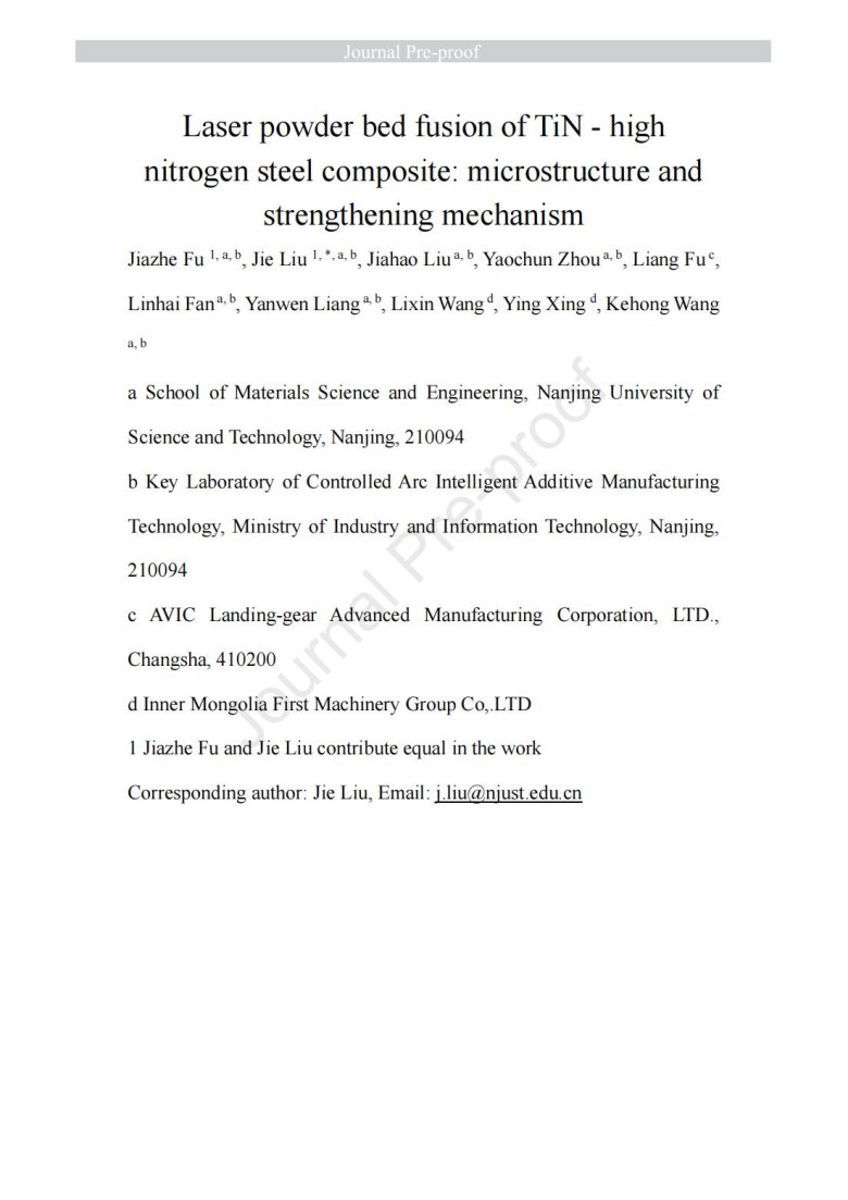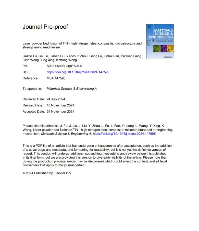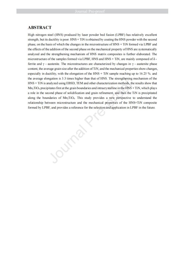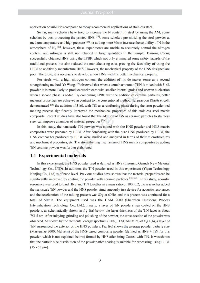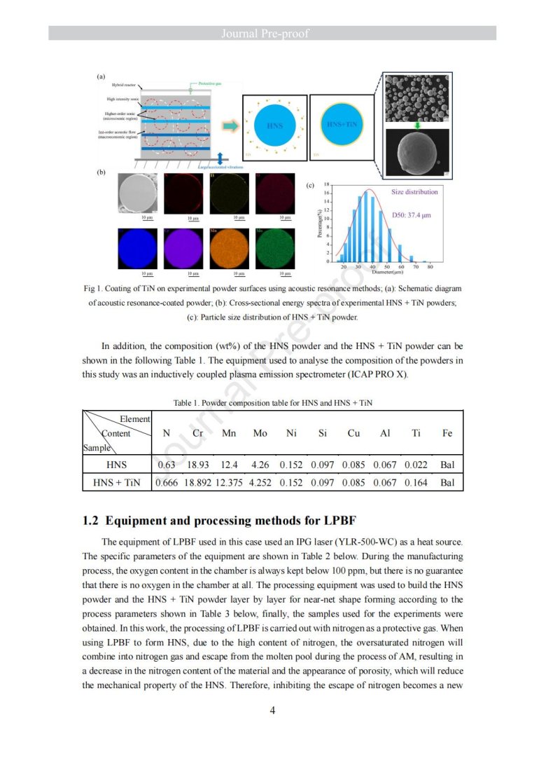 納米級陶瓷顆粒包覆金屬粉末改性(Laser powder bed fusion of TiN - high nitrogen steel composite: microstructure and strengthening mechanism)