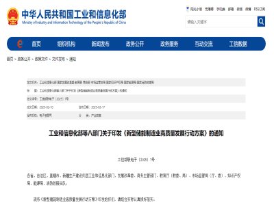 工業(yè)和信息化部等八部門聯(lián)合印發(fā)《新型儲能制造業(yè)高質(zhì)量發(fā)展行動方案》